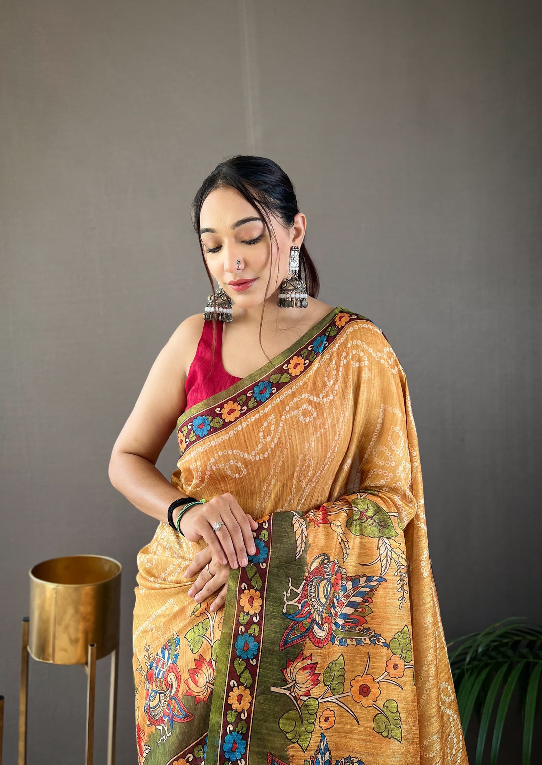 Chicora Pure soft cotton tussar silk saree with elegant prints and contrast pallu with contrast blouse and tassels