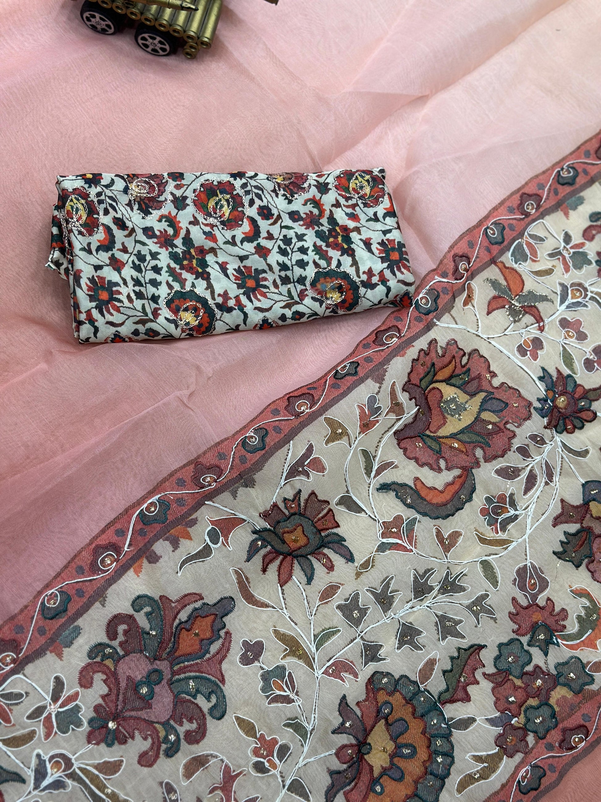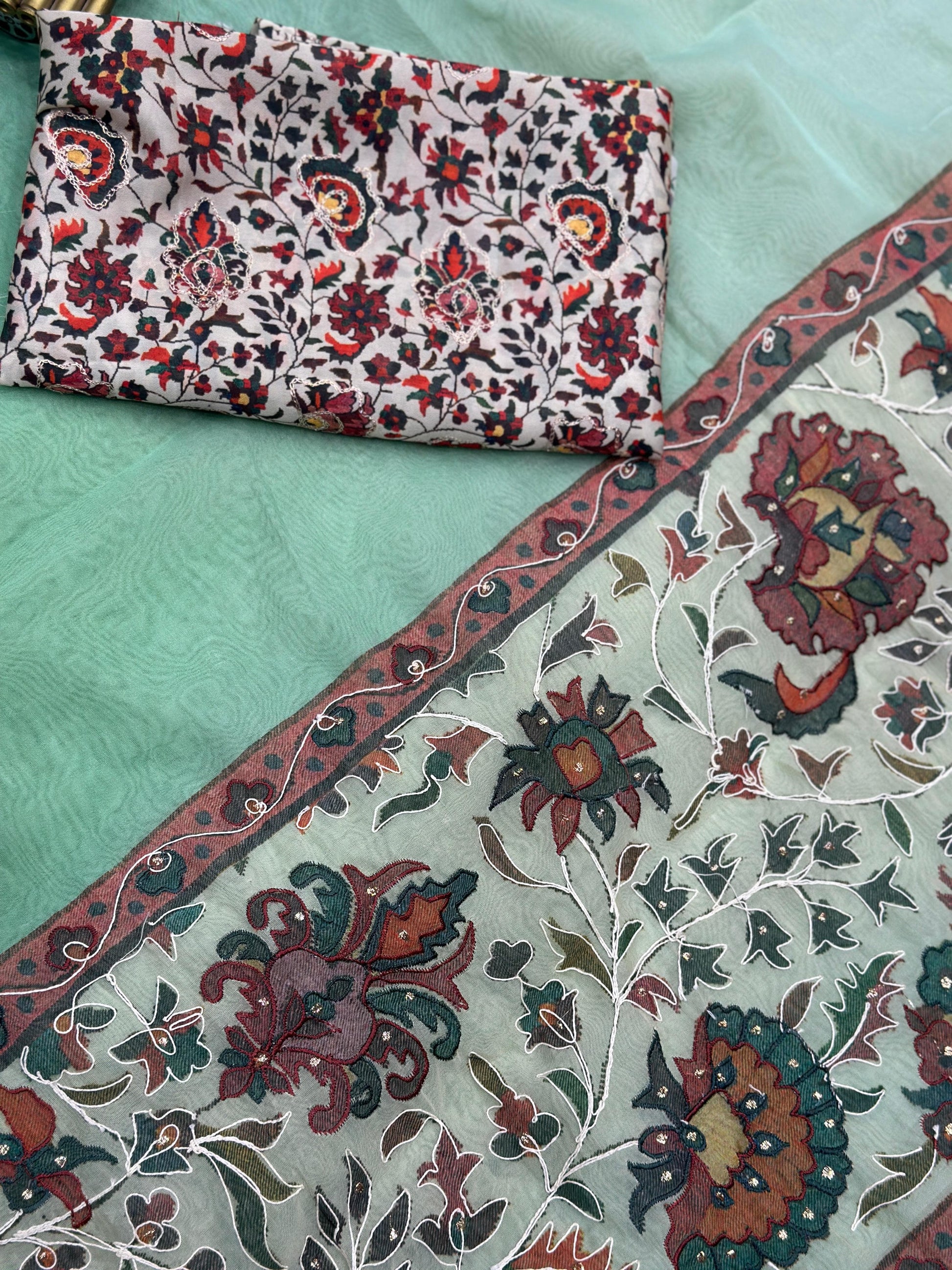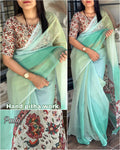 | Pattern | Saree- shades printed saree with ajrakh printed pallu & hand pitha work in pallu Blouse-Digital print with zari work |