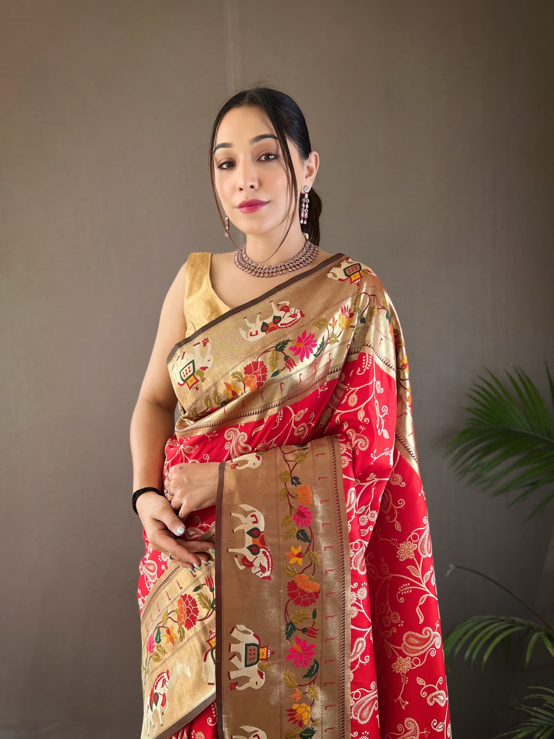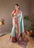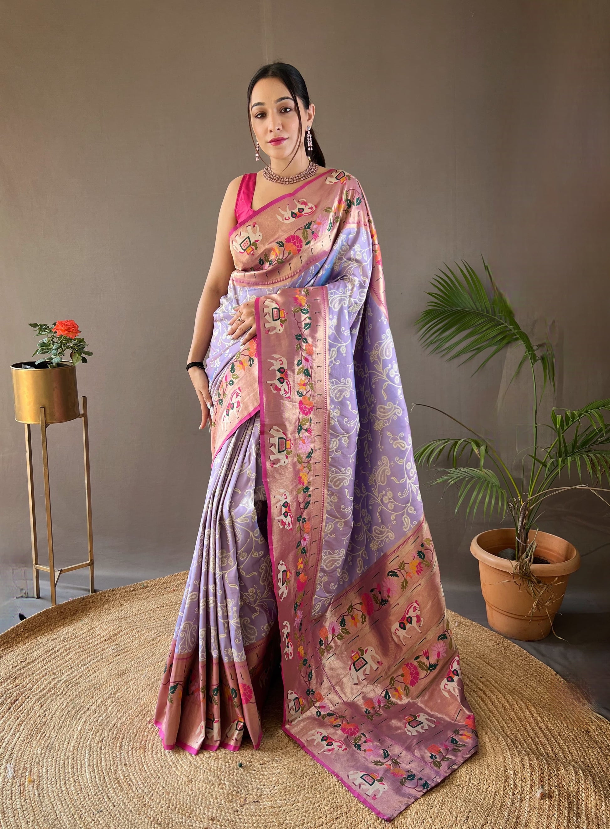 | Pattern:- | Beautiful Lucknowi Concept weaving saree with Paithani and Patola fusion Taste with rich Meenakari pallu and elegant border having Natural Concept with rich Golden Zari Blend along with contrast blouse. |