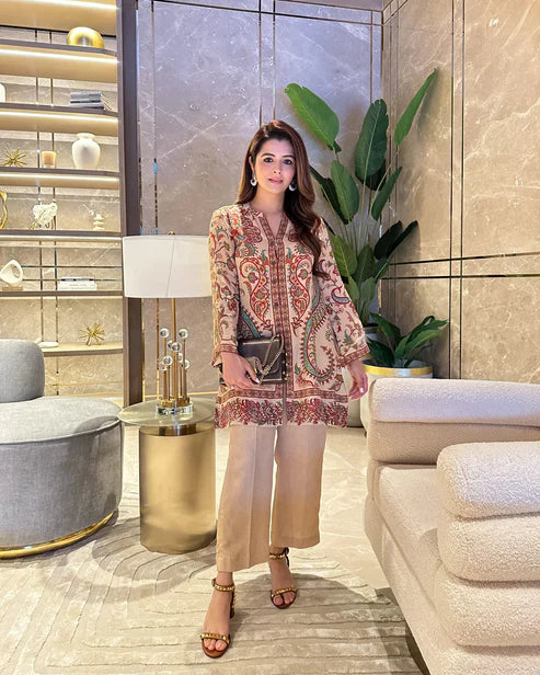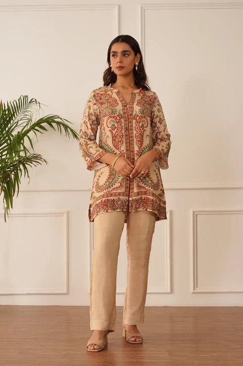 Introducing our "Beige Printed Crepe Set" – a captivating blend of Indian ambi and paisley motifs in a contemporary context. This ensemble features a timeless beige print that seamlessly marries delicate Indian hues with modern Western shades. A subtle infusion of red enhances the entire look, adding a touch of vibrancy.
