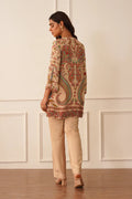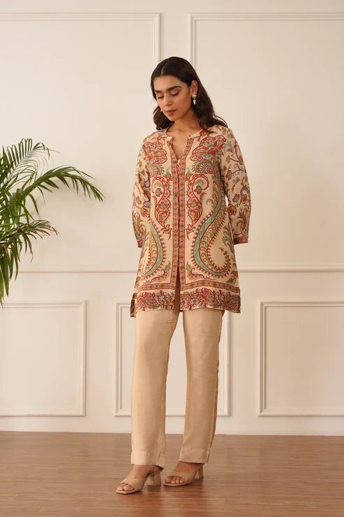 The fusion of traditional Indian motifs with Western tones creates an alluring visual tapestry that beautifully bridges cultures. Tonal straight pants complete the ensemble, ensuring a harmonious and elegant silhouette.