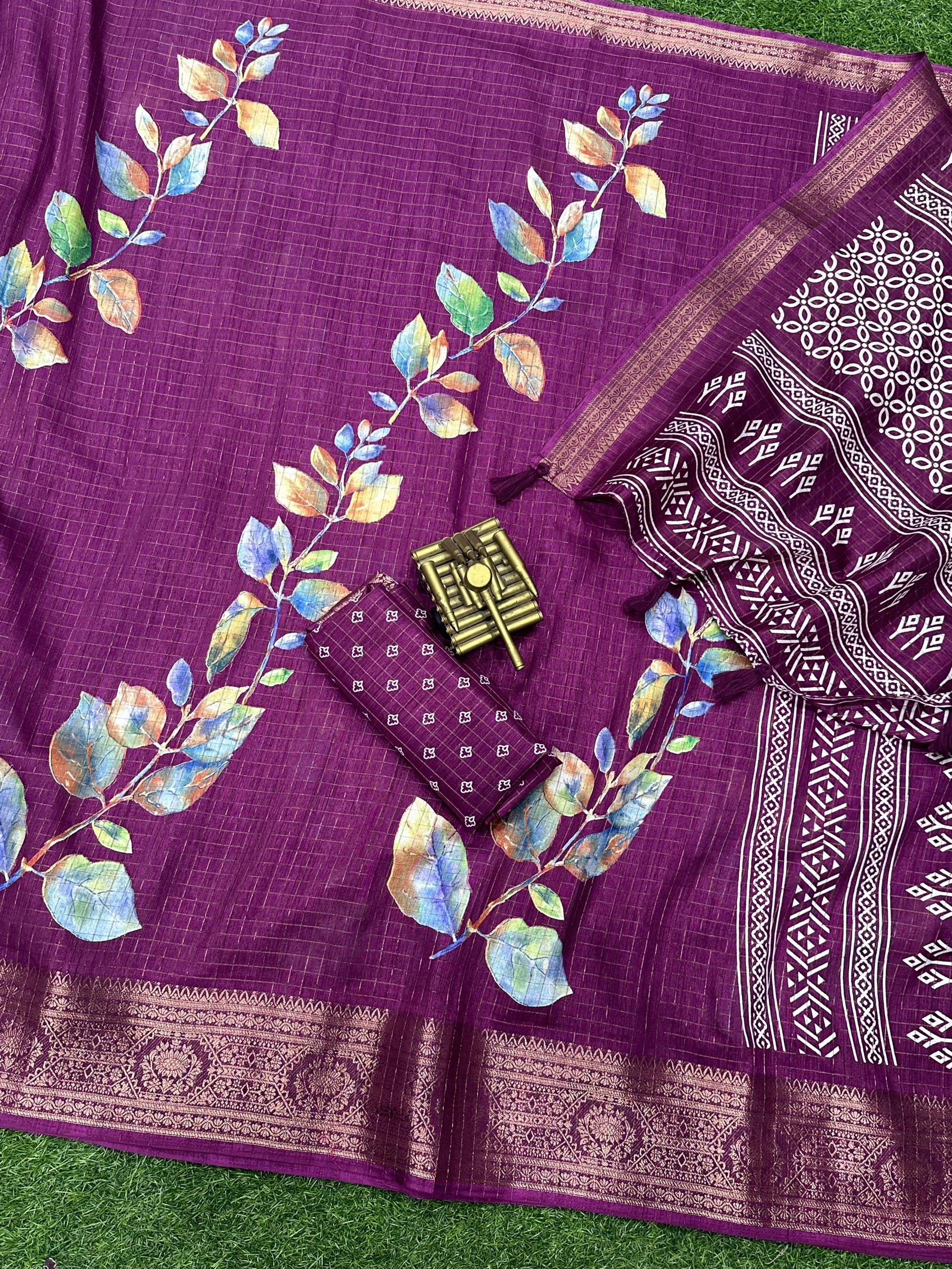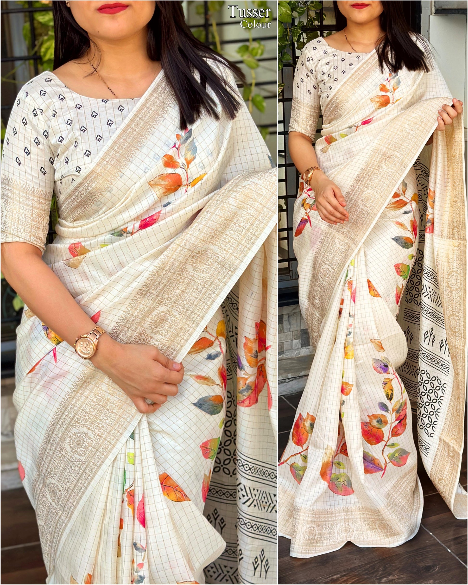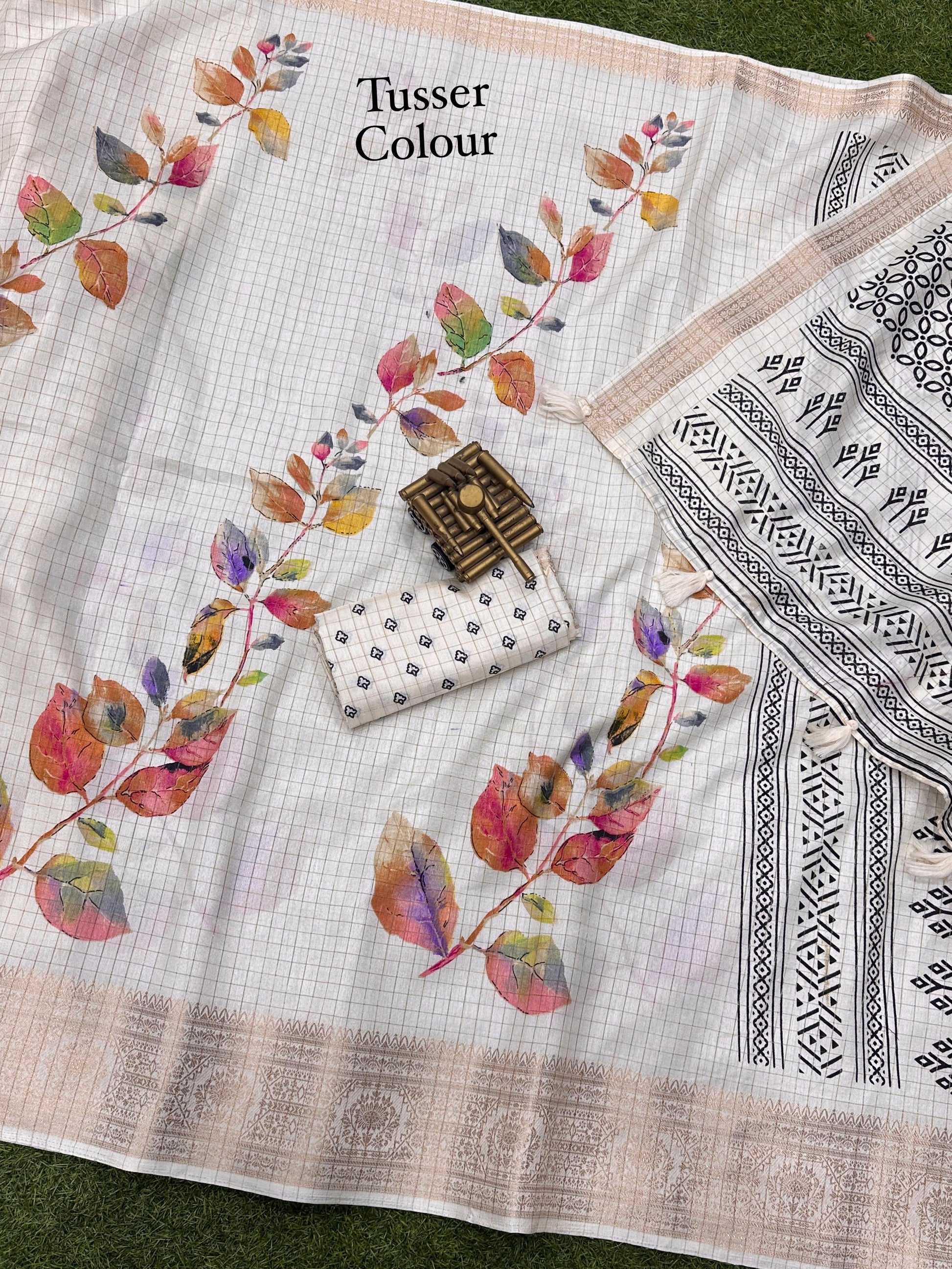 | Pattern | Designer hand printed saree with zari weaving checks and boder & tussles in pallu |