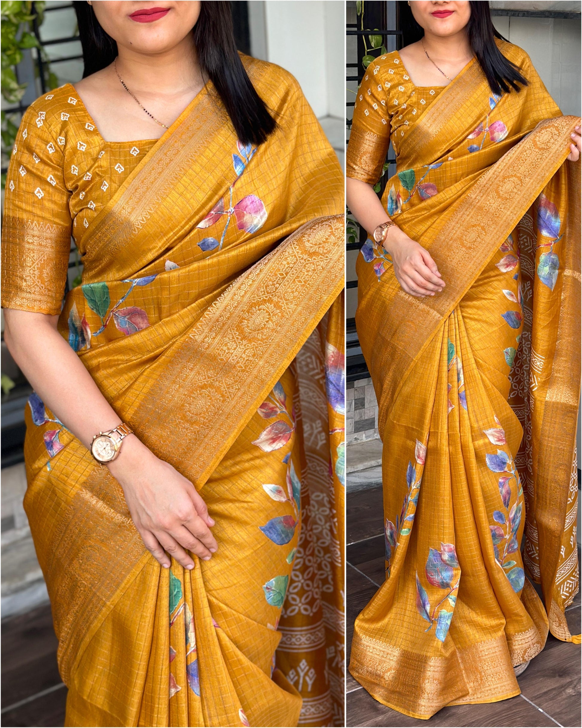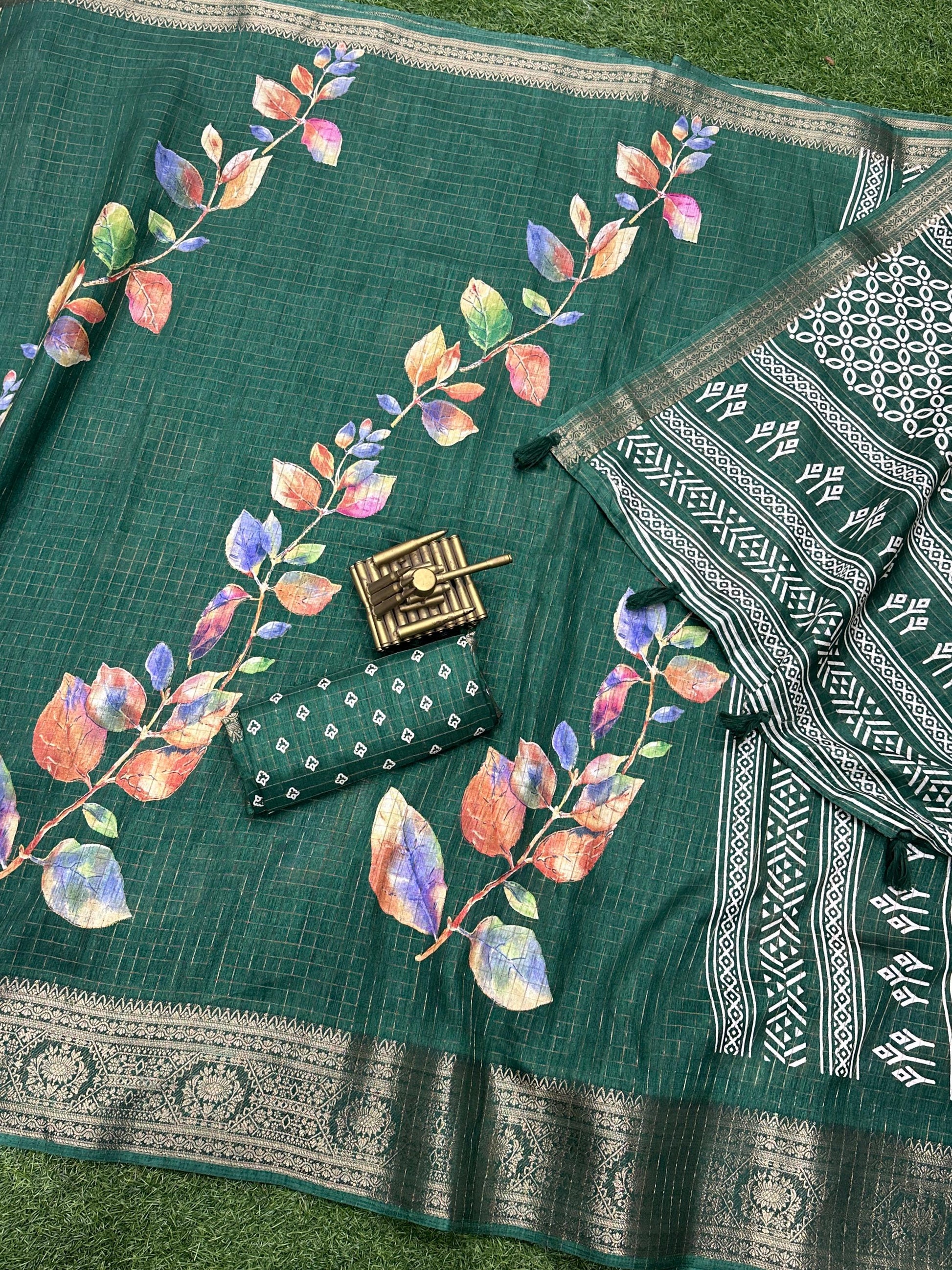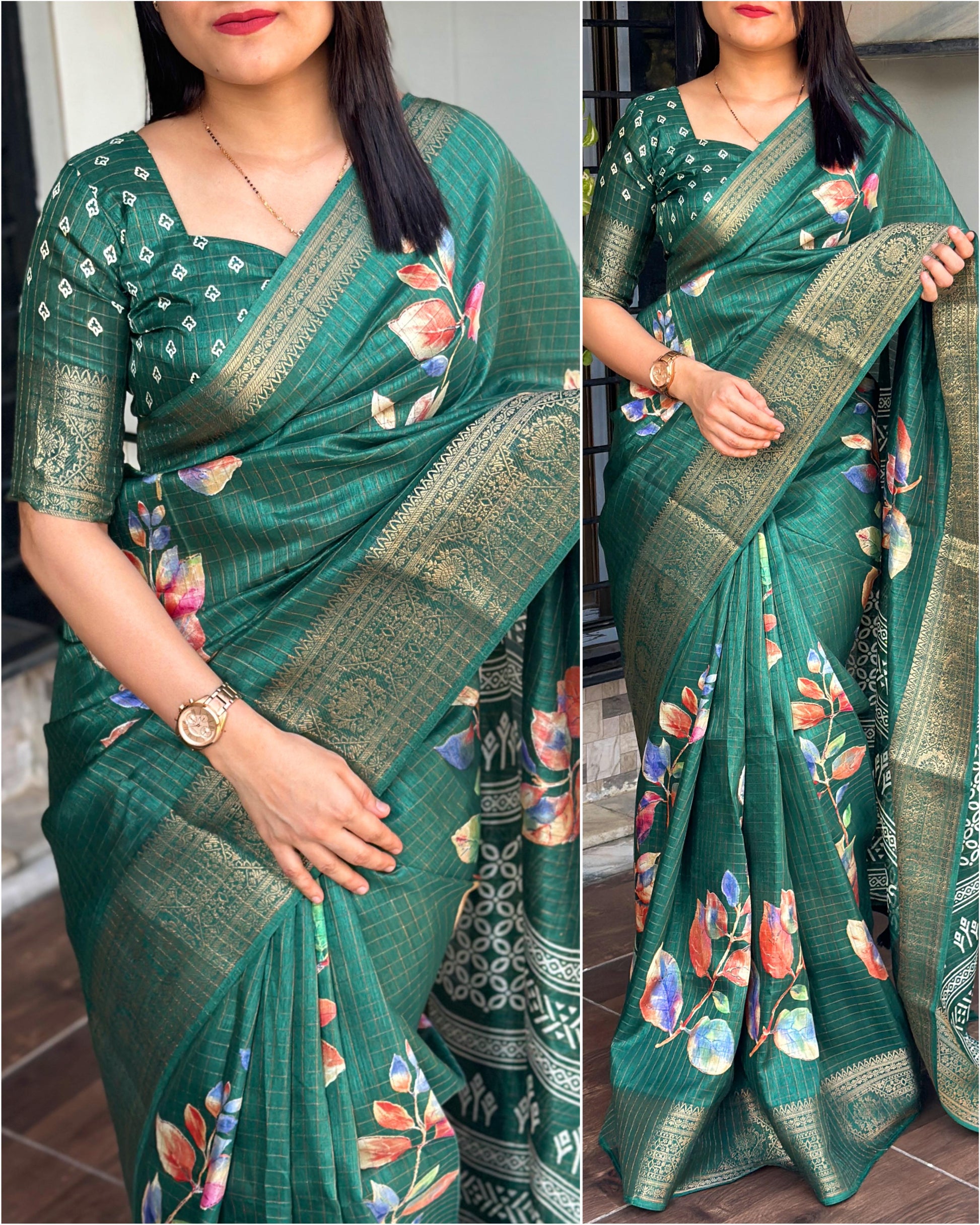 | Pattern | Designer hand printed saree with zari weaving checks and boder & tussles in pallu |
