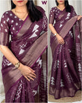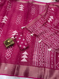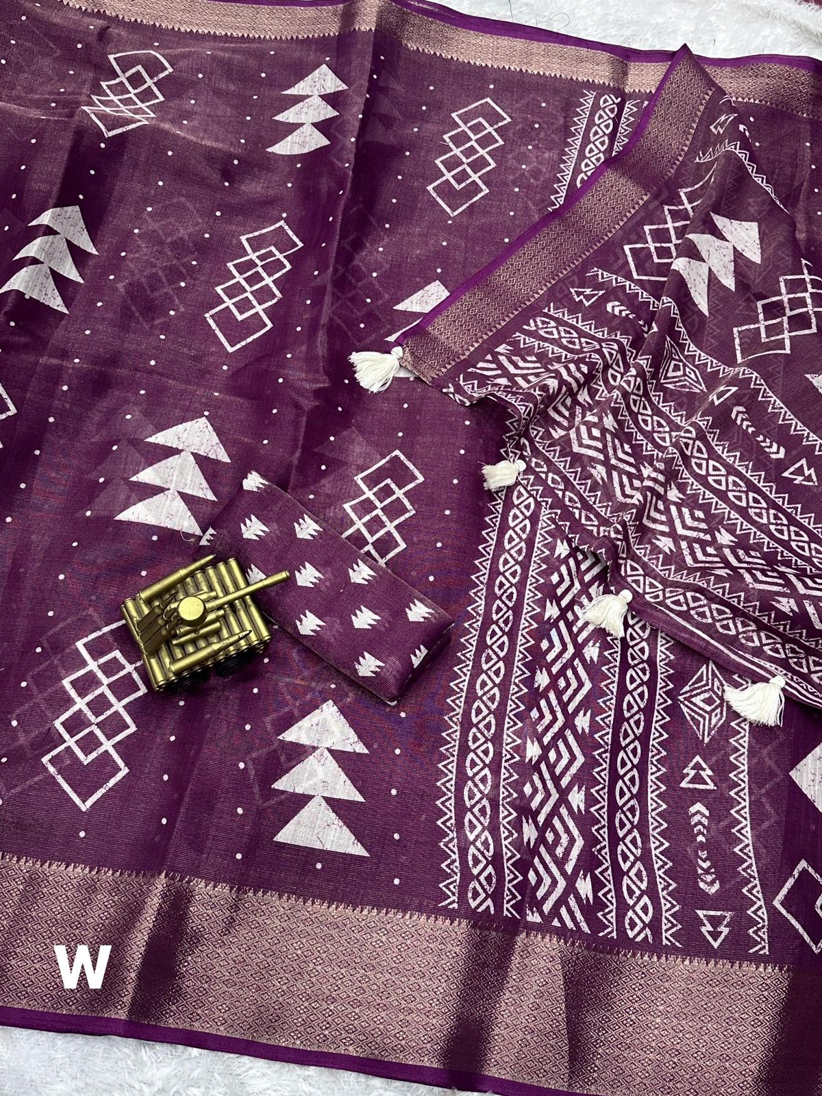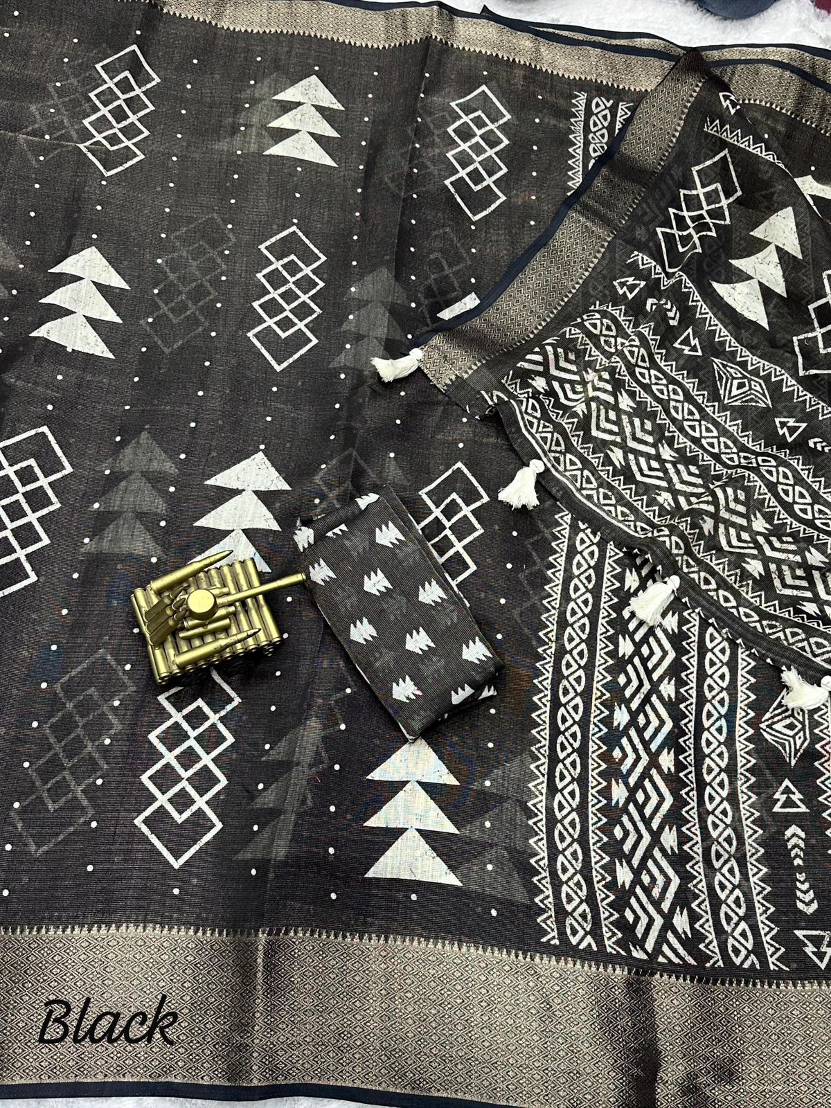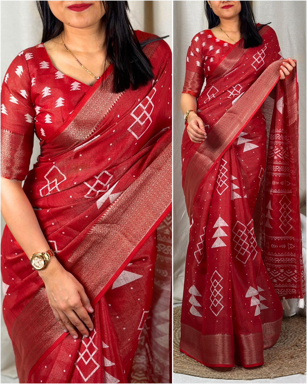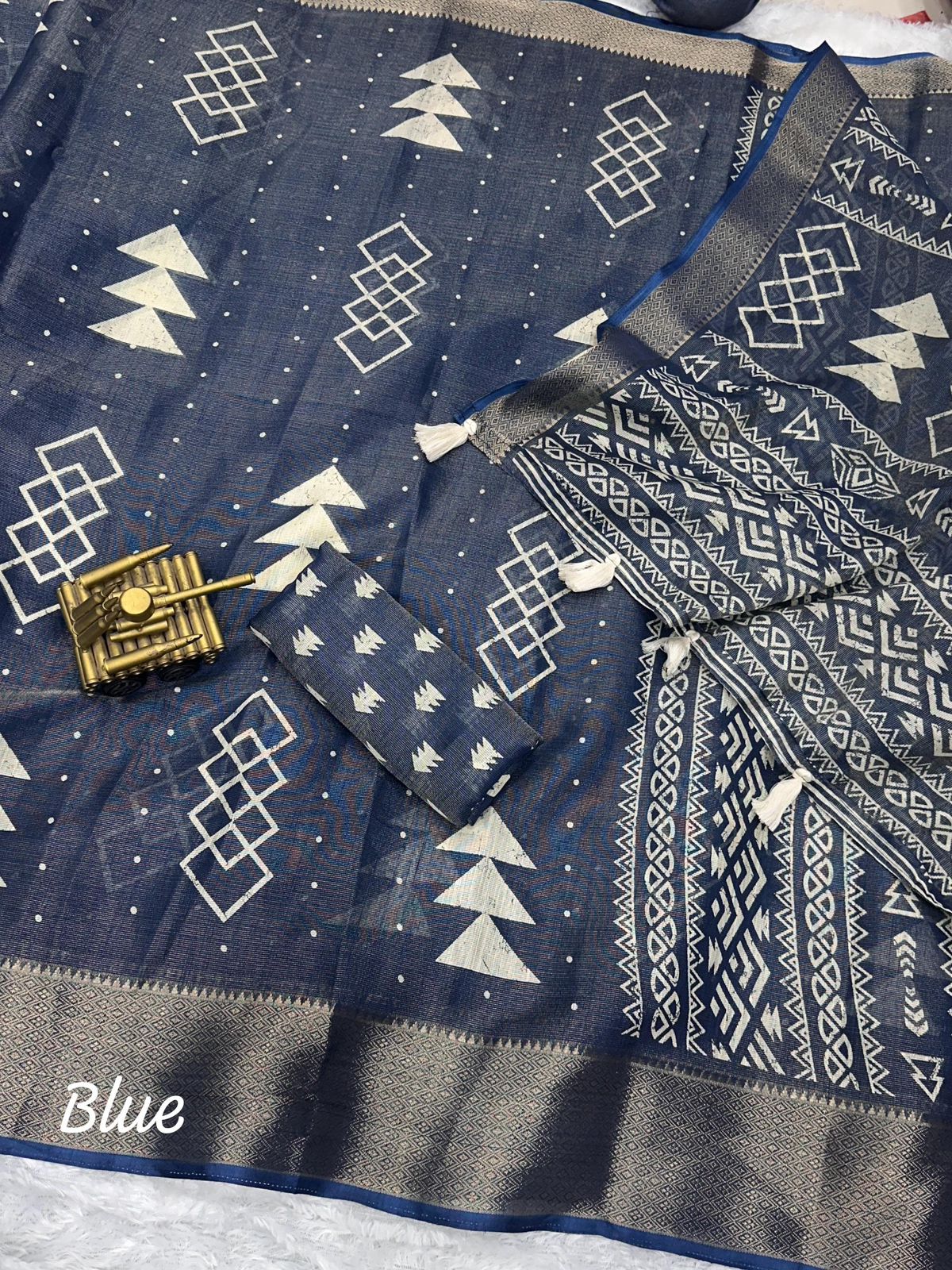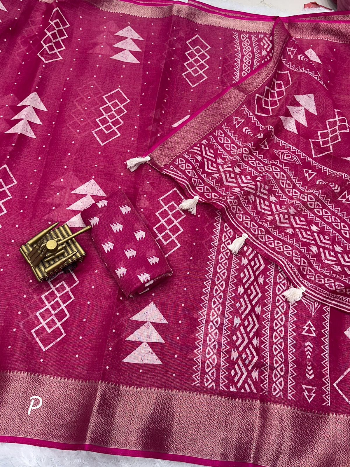 | Pattern | Designer hand printed saree with zari weaving in full saree and zari boder & tussles in pallu |
