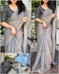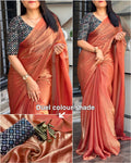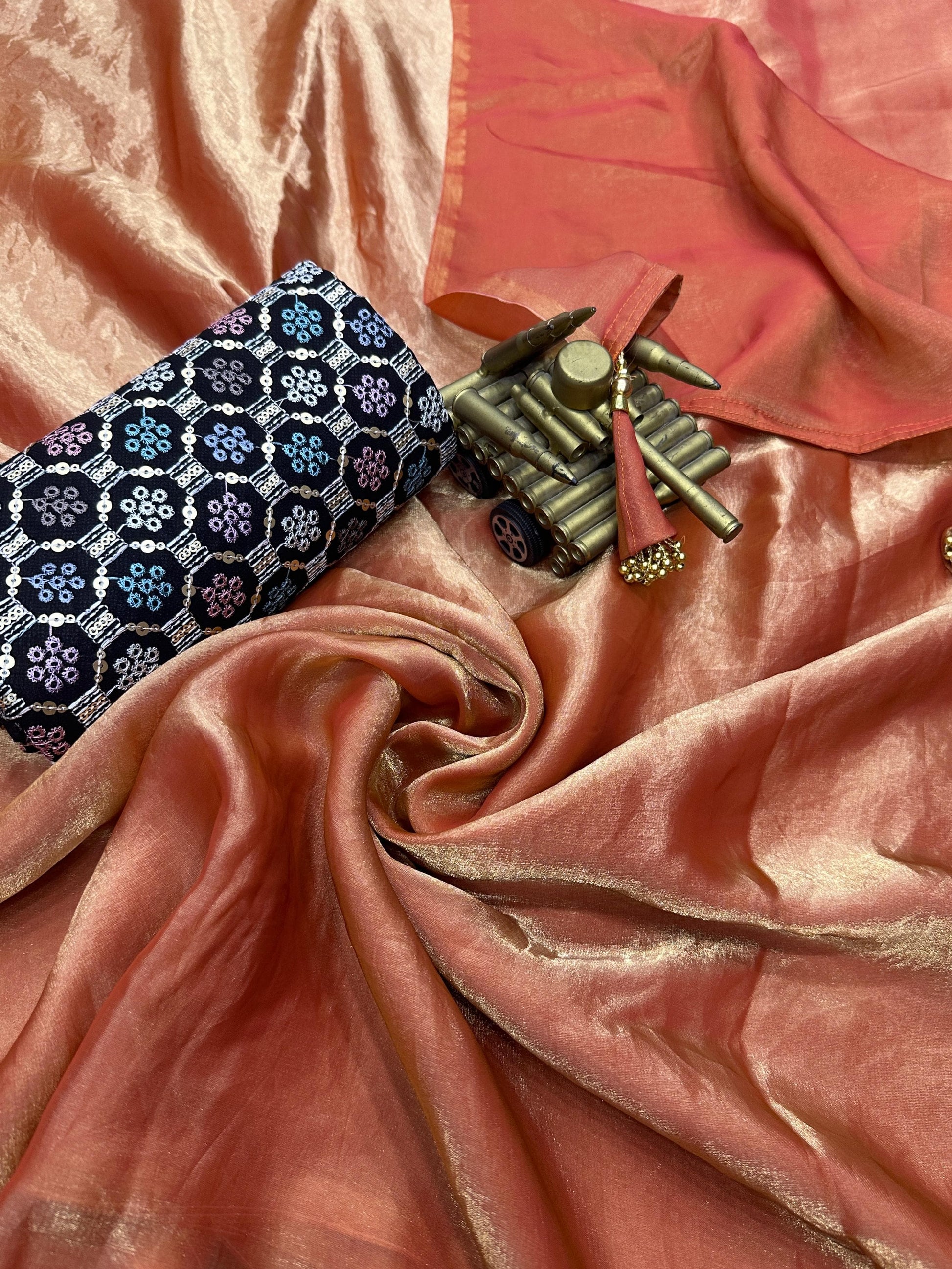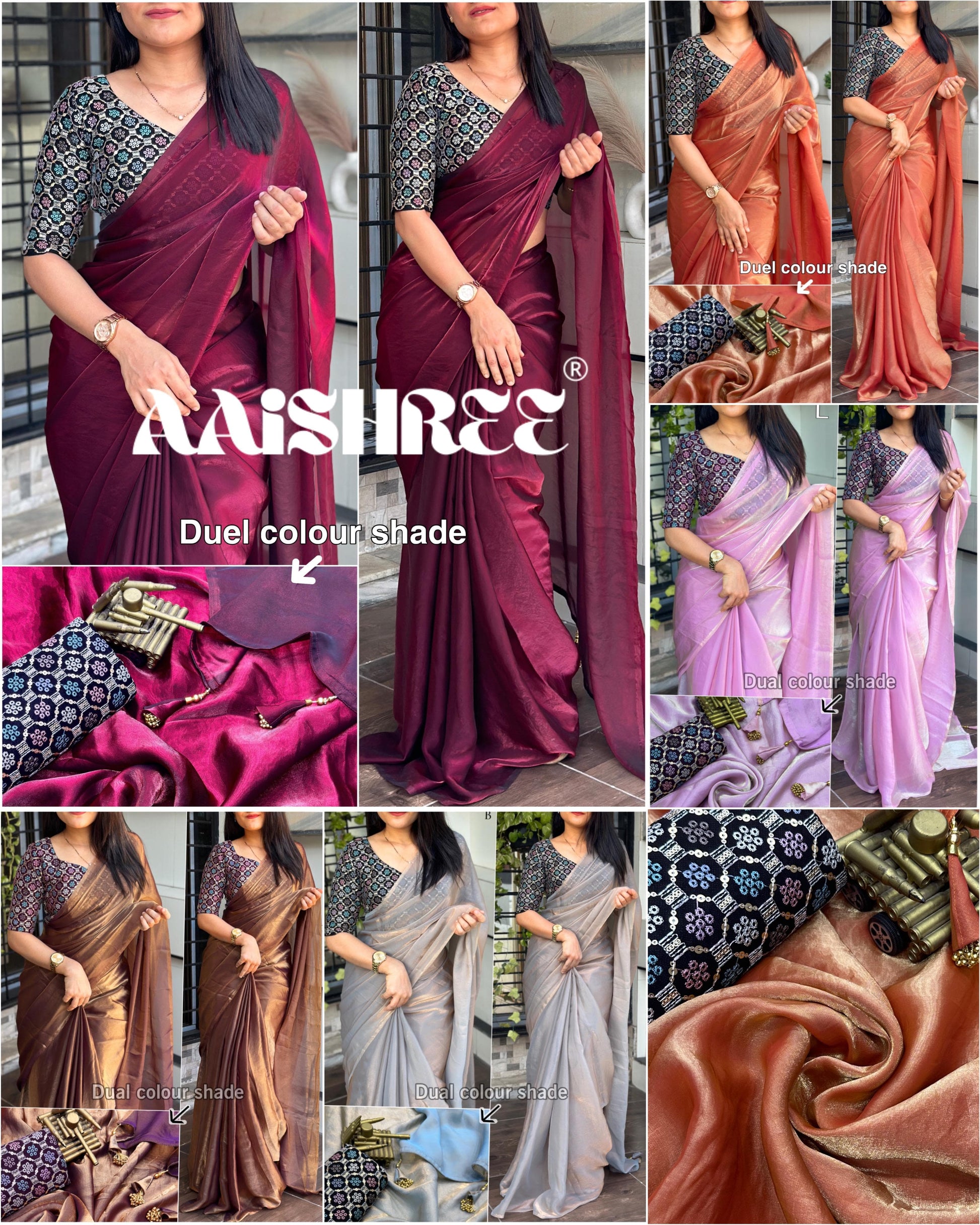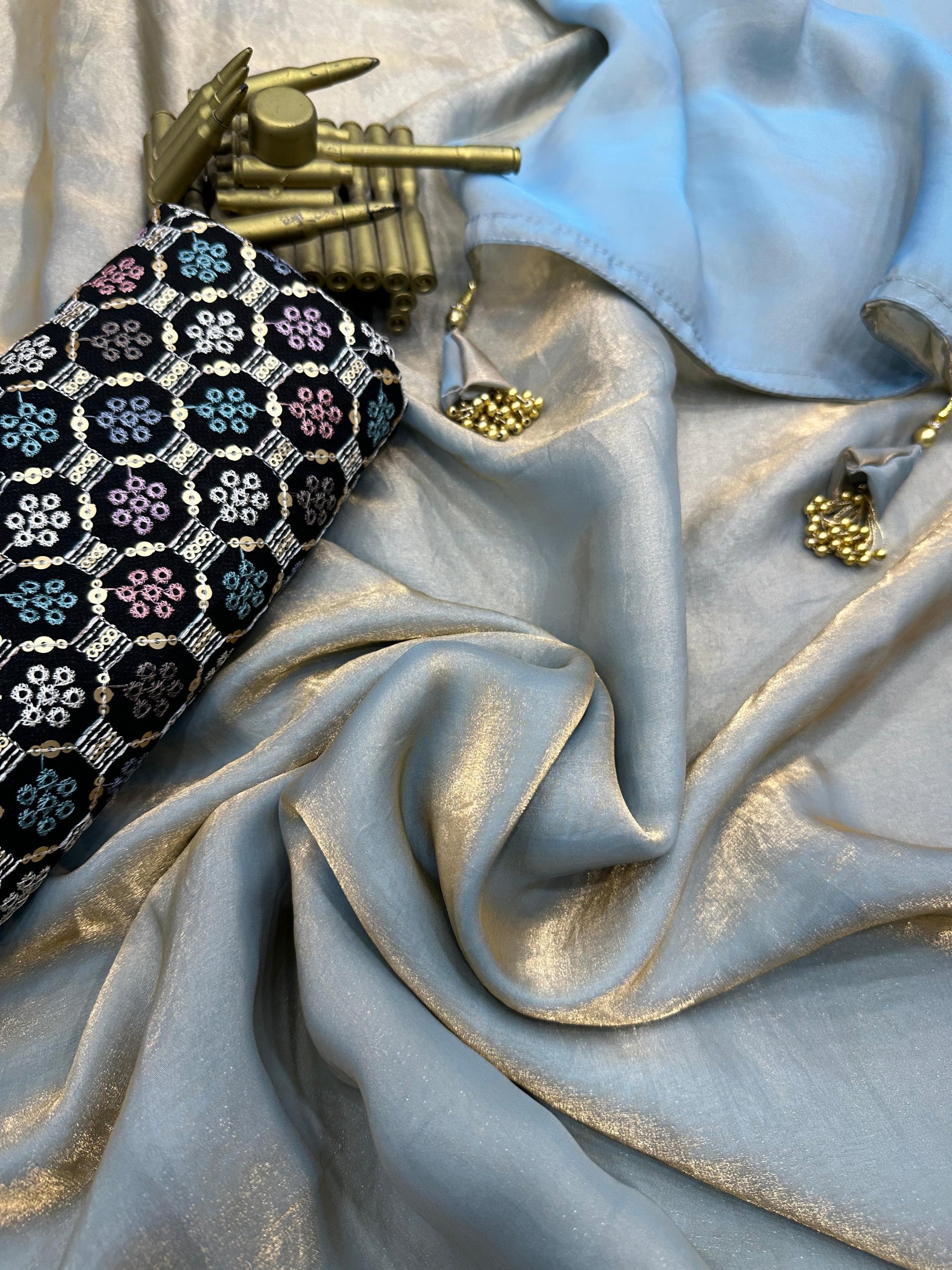 | Work | Saree- Dual shade saree with fancy pearl tussles Blouse- multi colored thread embroidered work and Matt gold sequins.  |