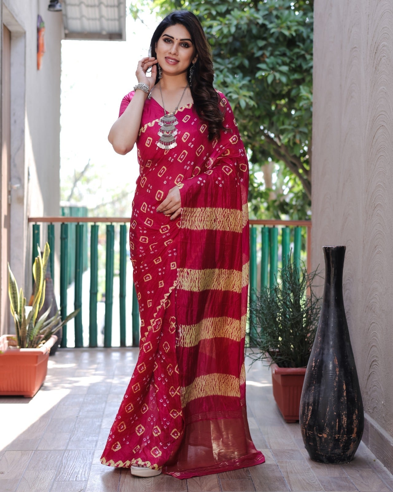 | Pattern | Bandhej Border with Zari Weaving Rich Tissue Pallu & Original Sibory Design saree with beautiful Bandhej design and having a Bandhej Rich Pallu. |