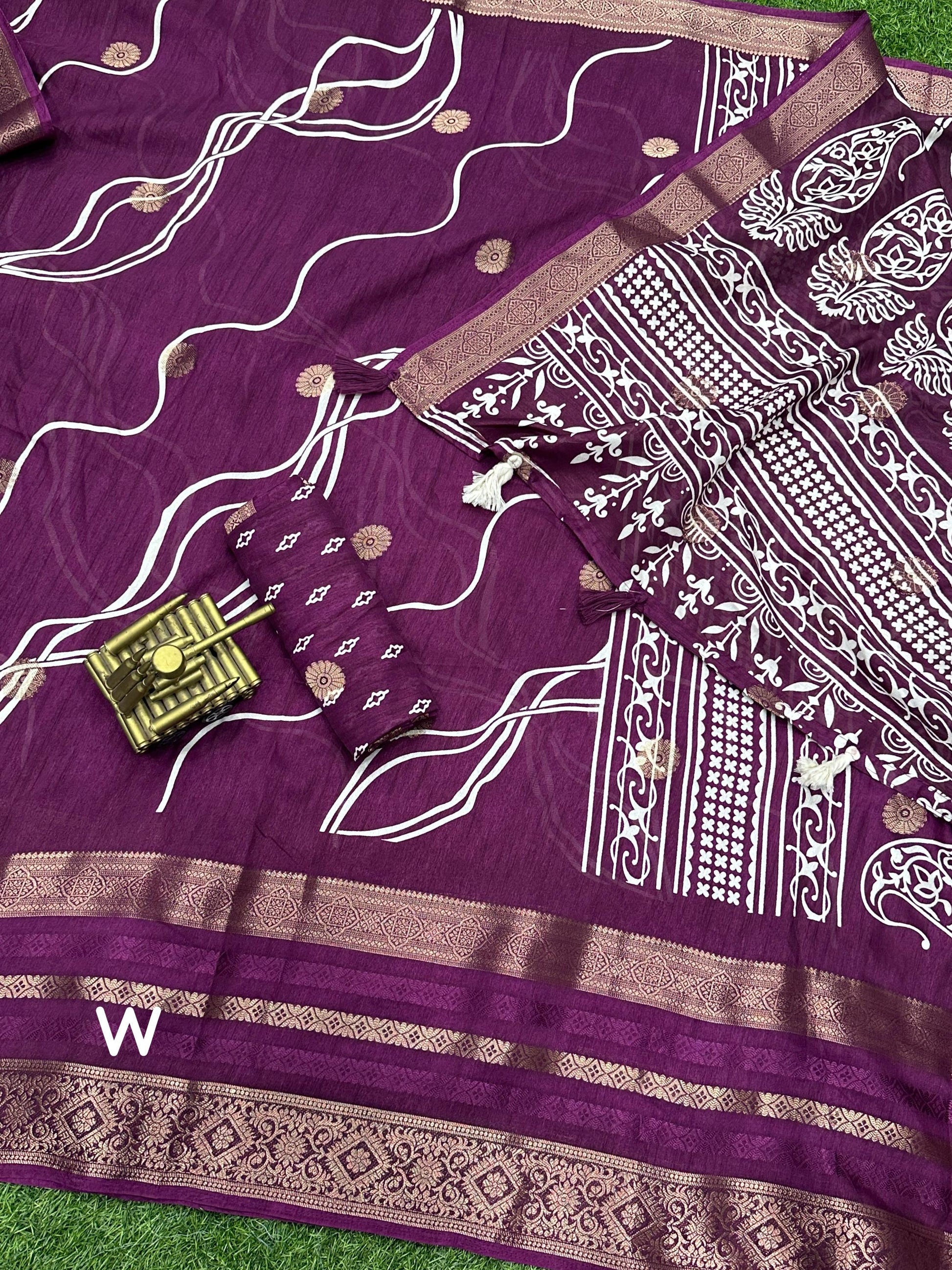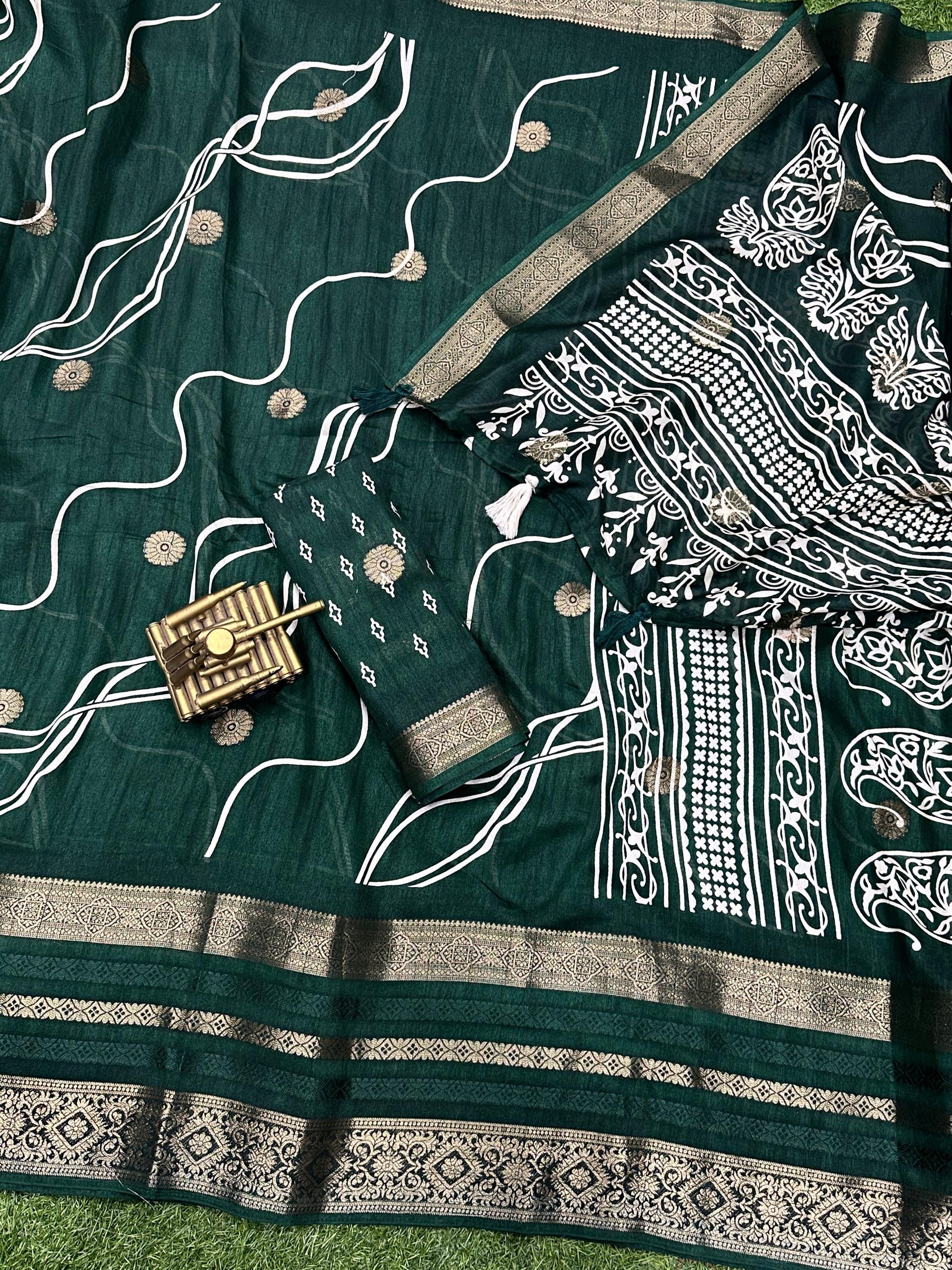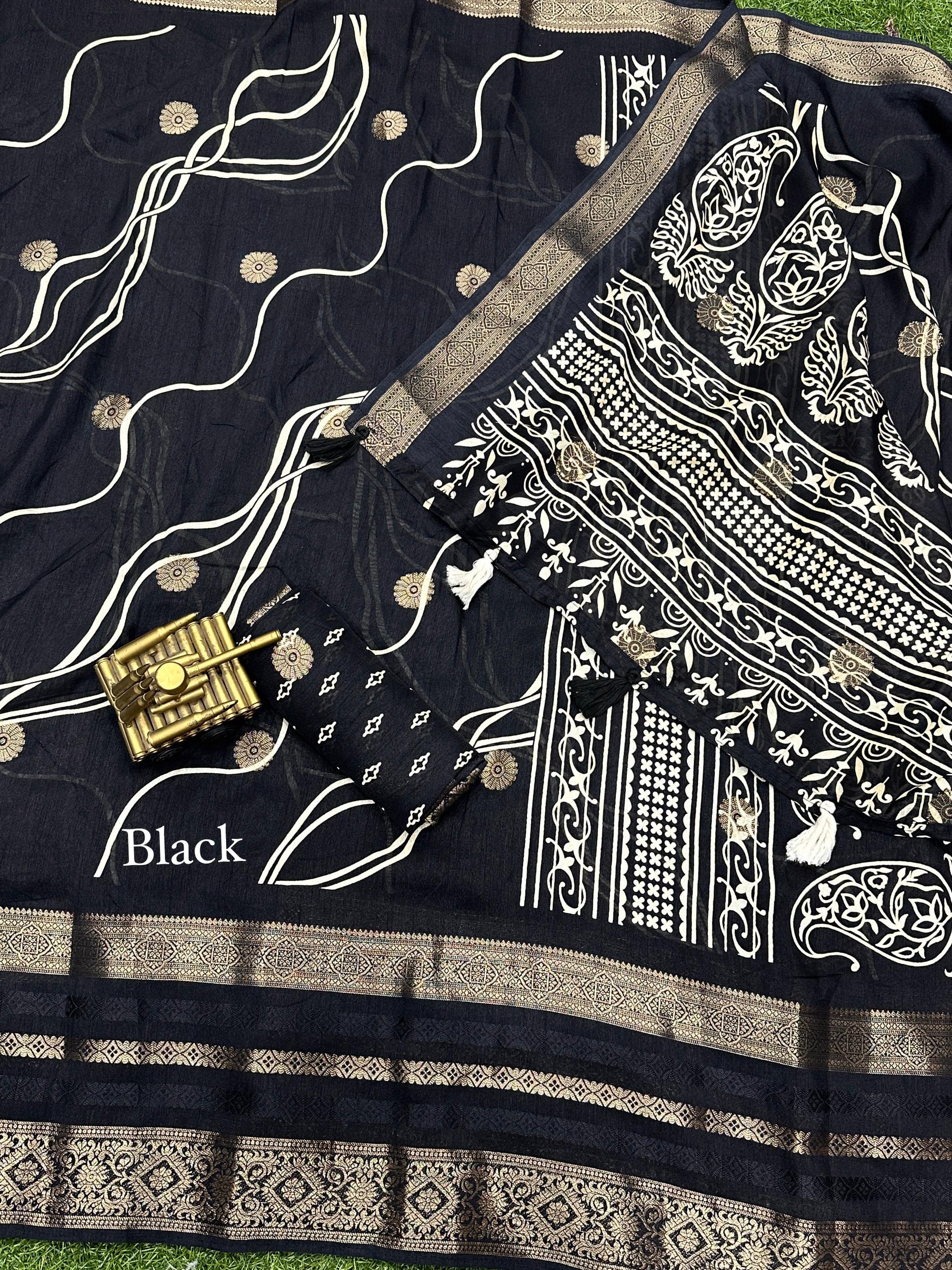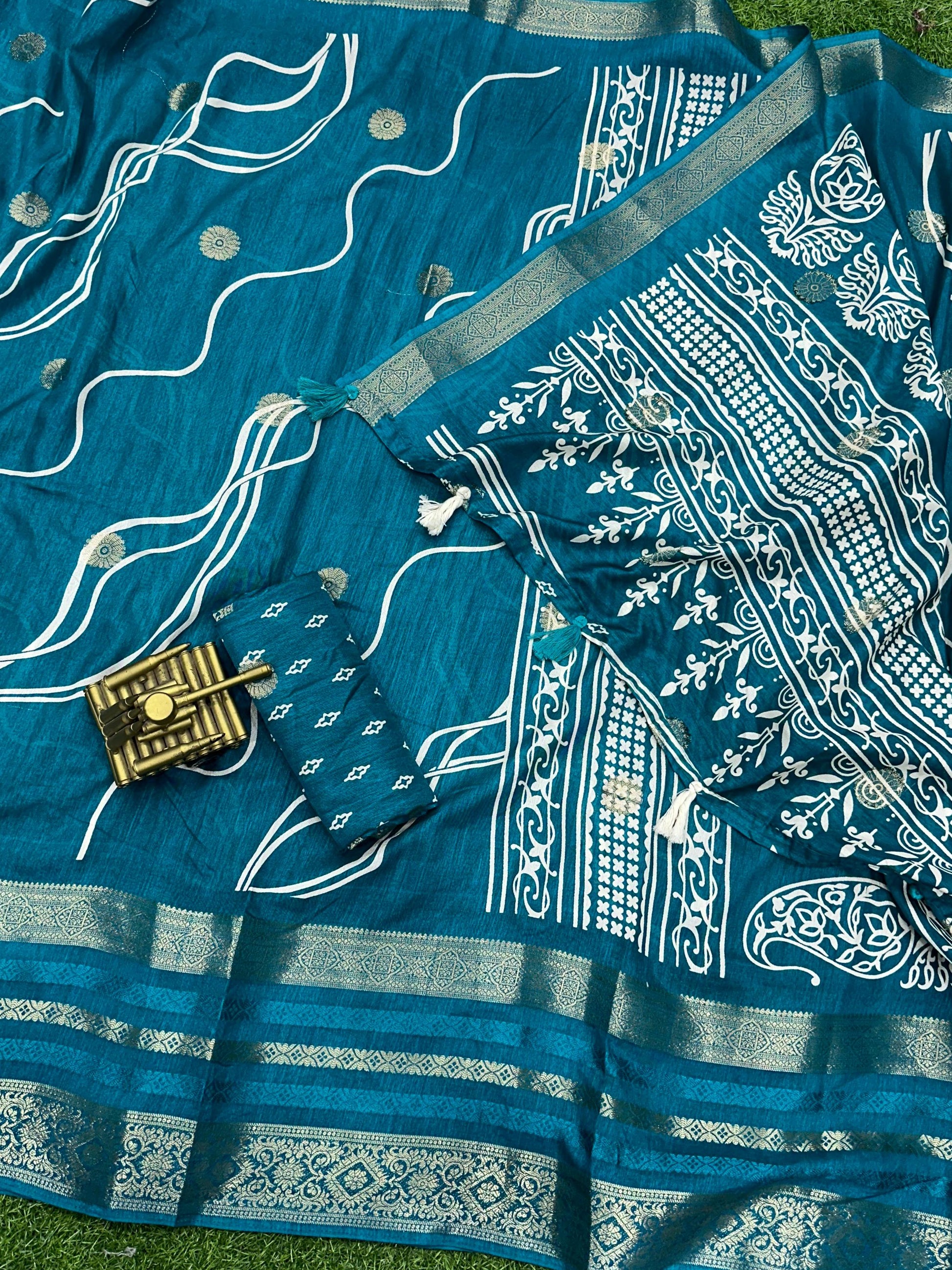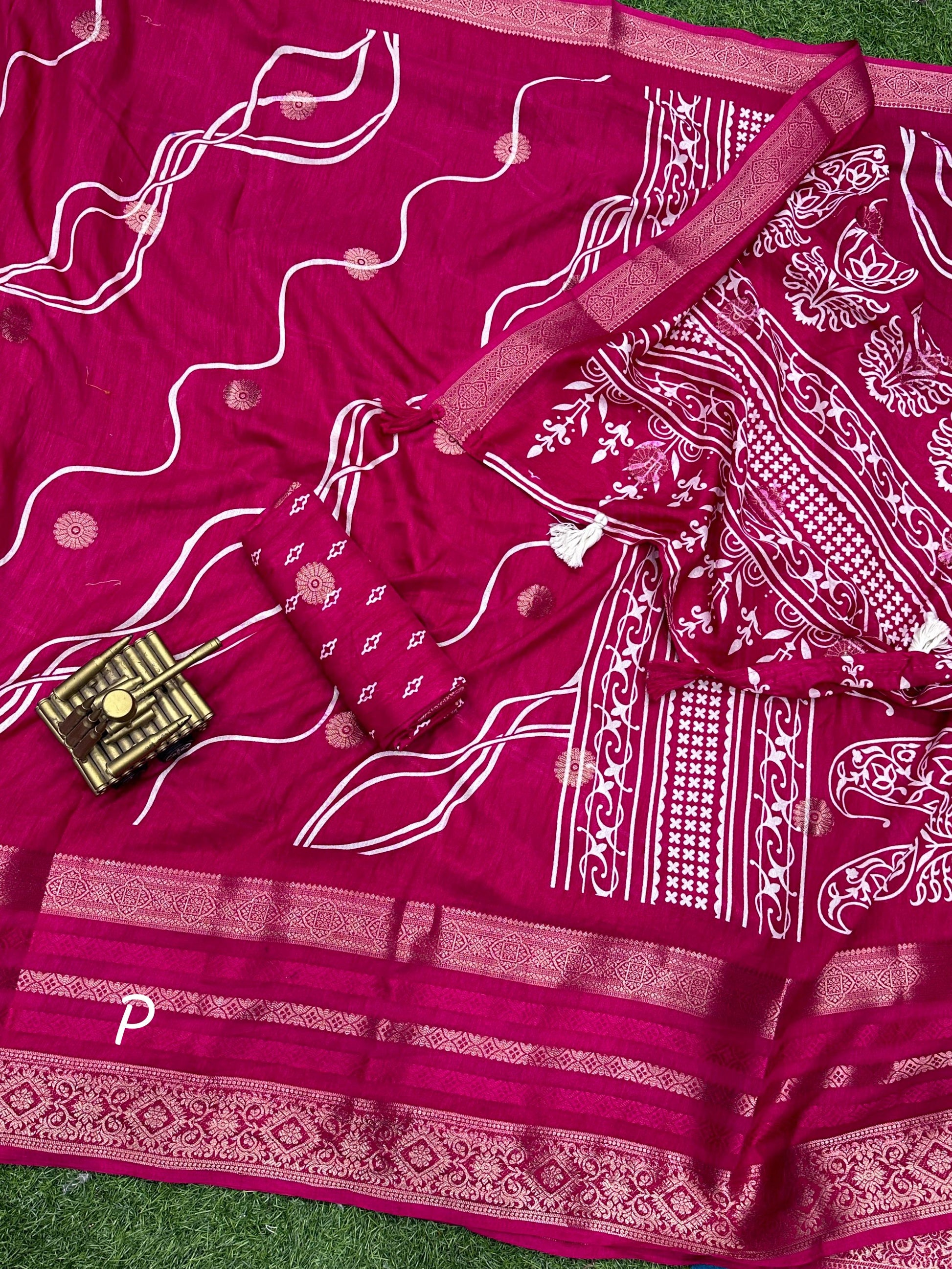 | Pattern | printed saree with zari jacquard butti and boder & tussels in pallu |