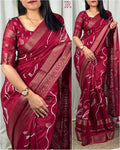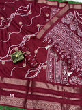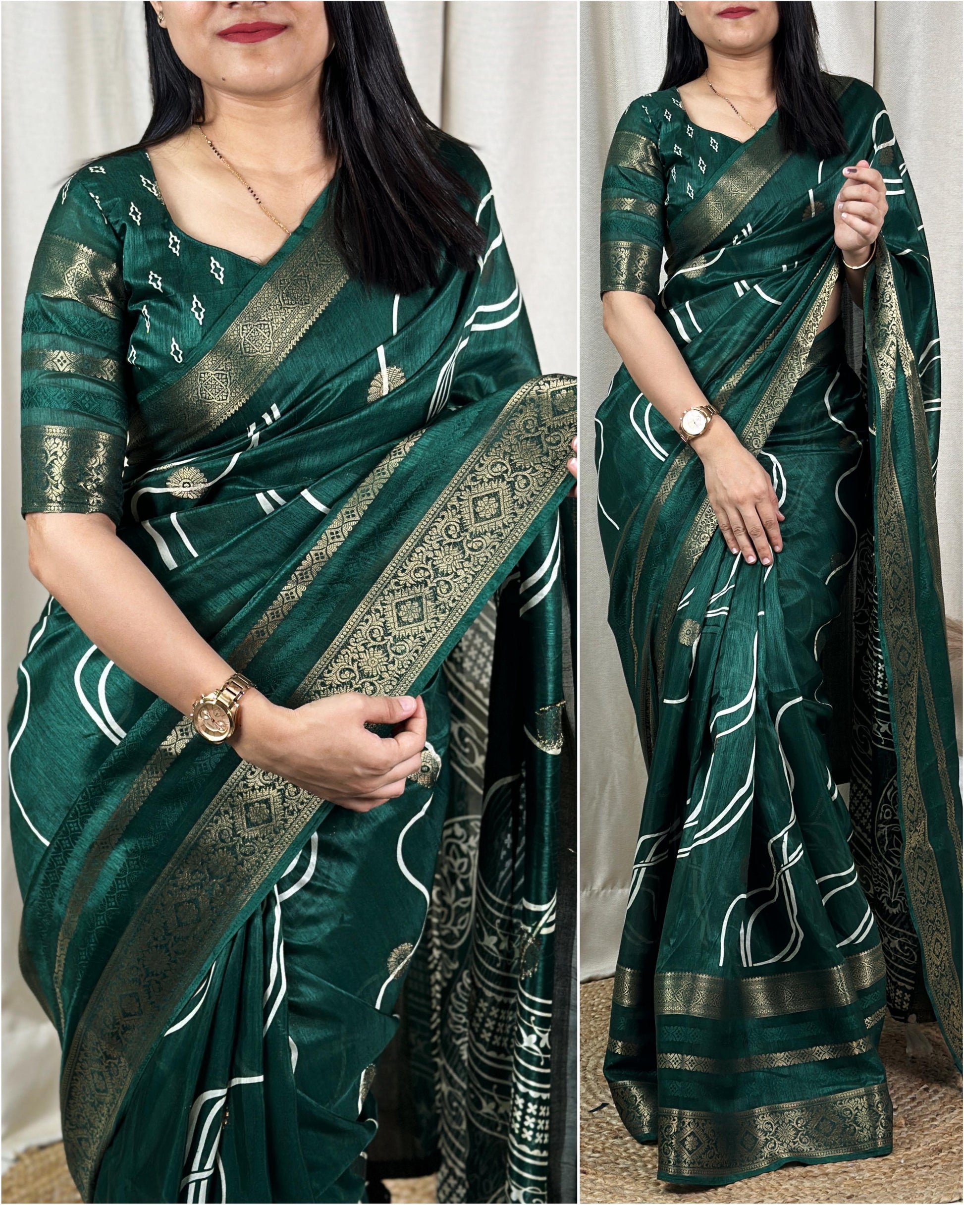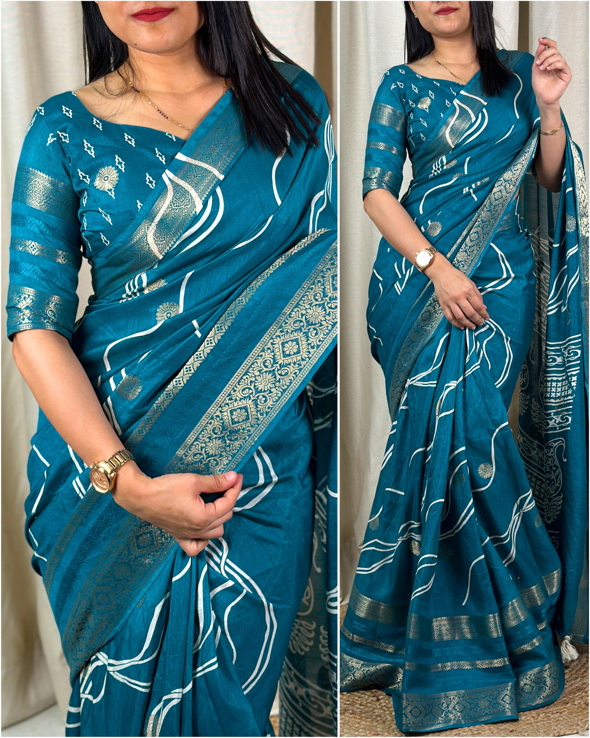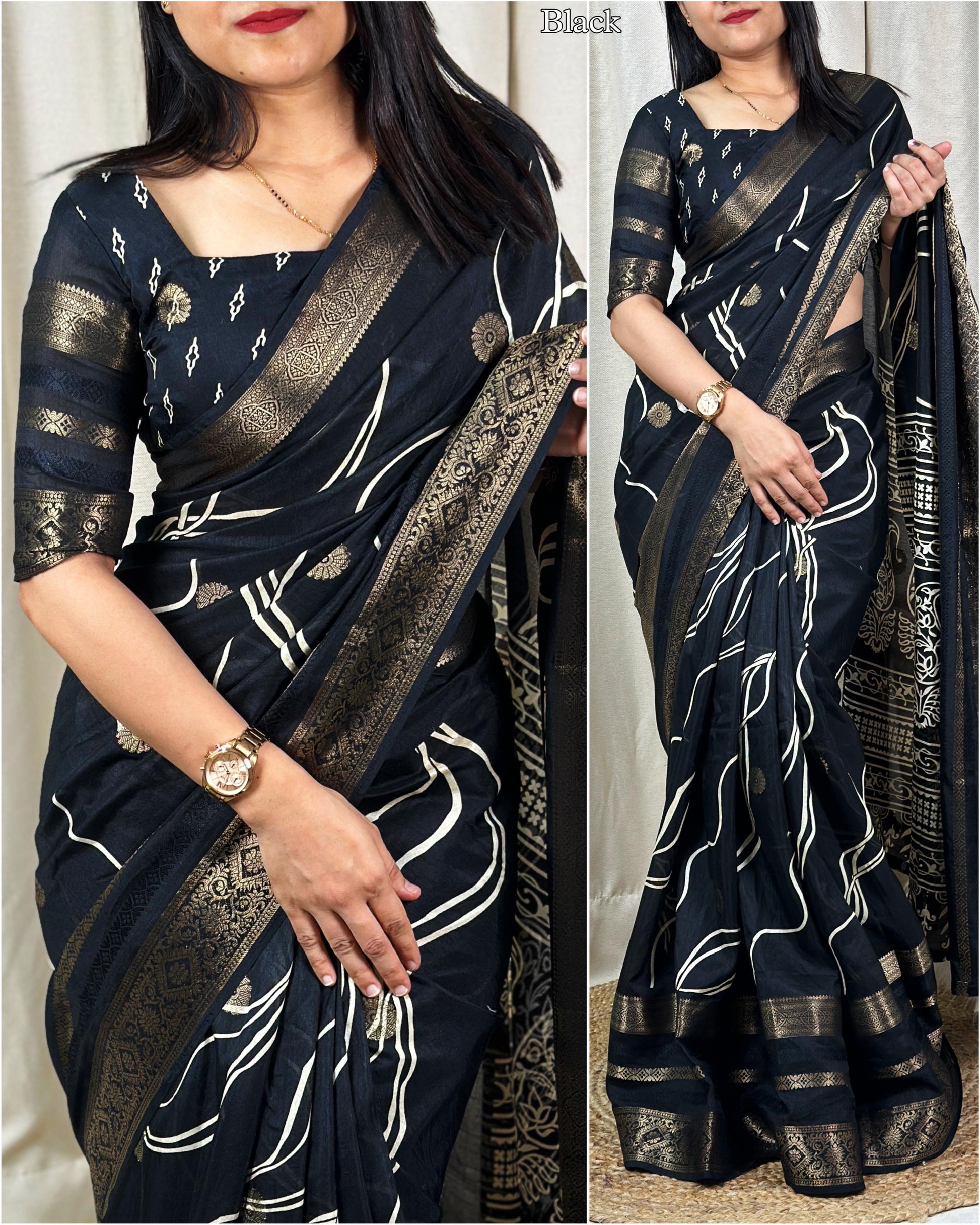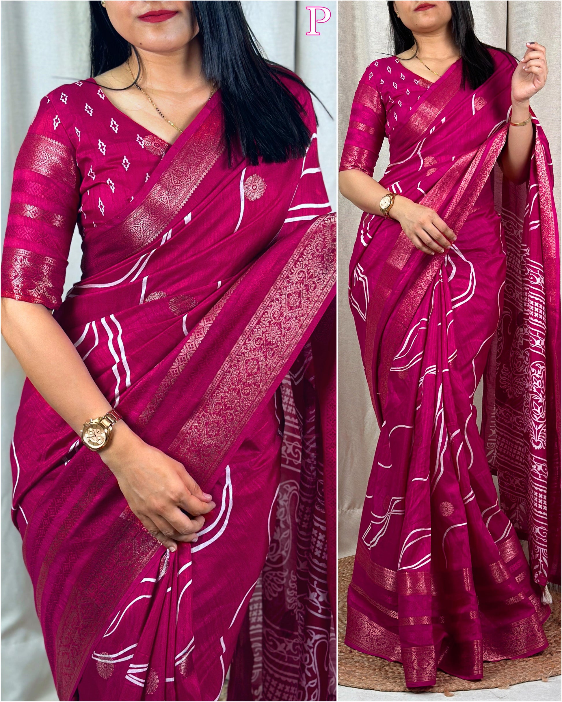 | Pattern | printed saree with zari jacquard butti and boder & tussels in pallu |