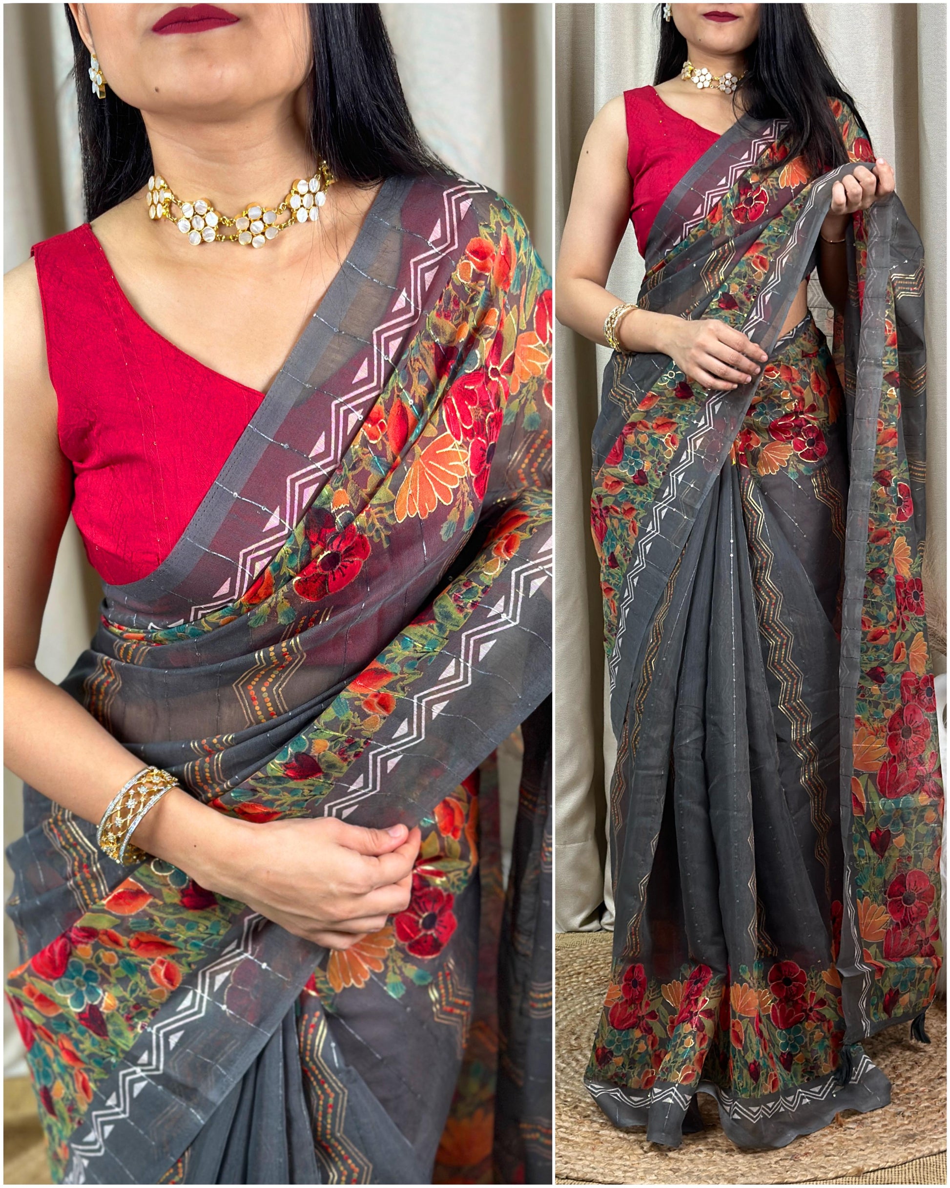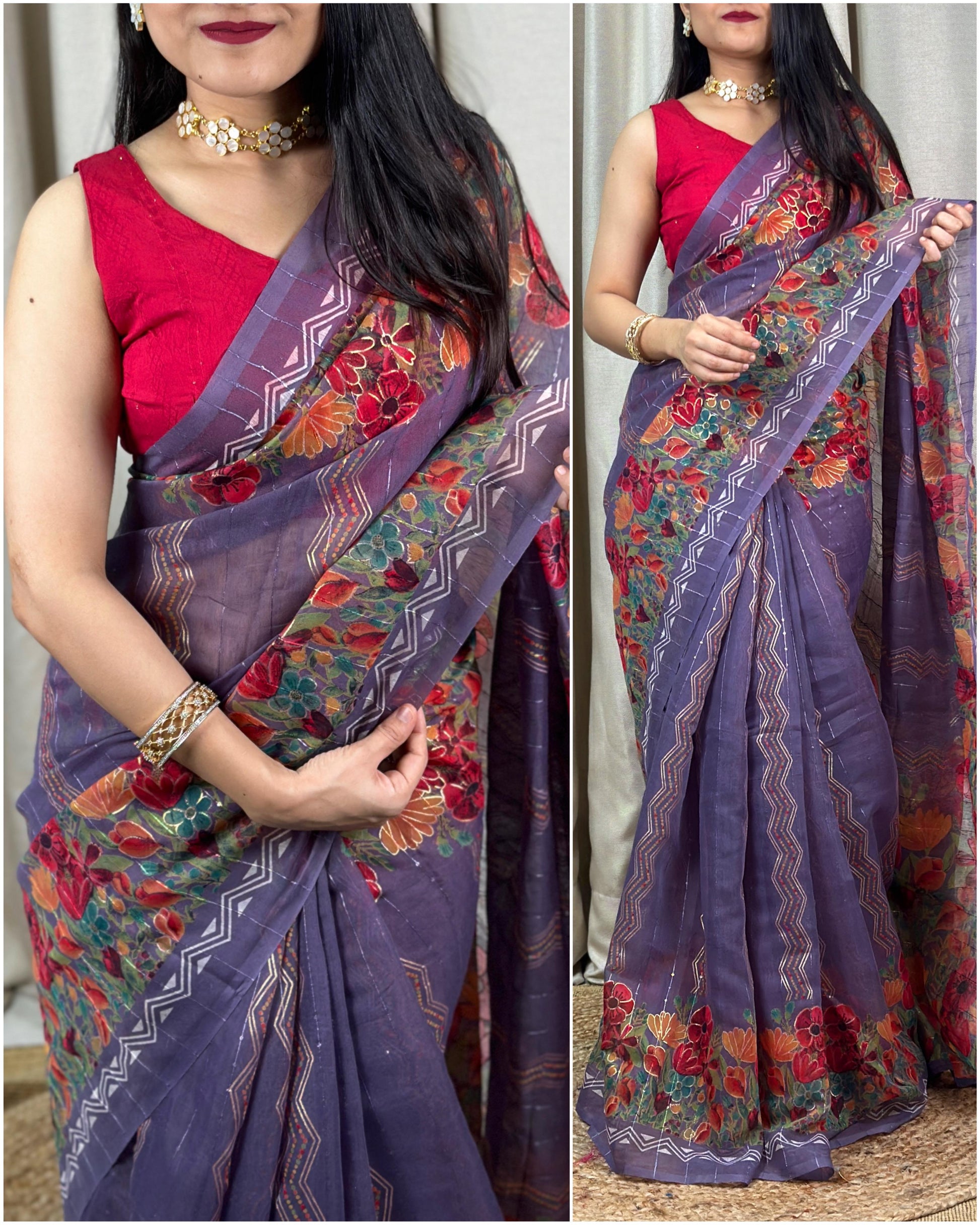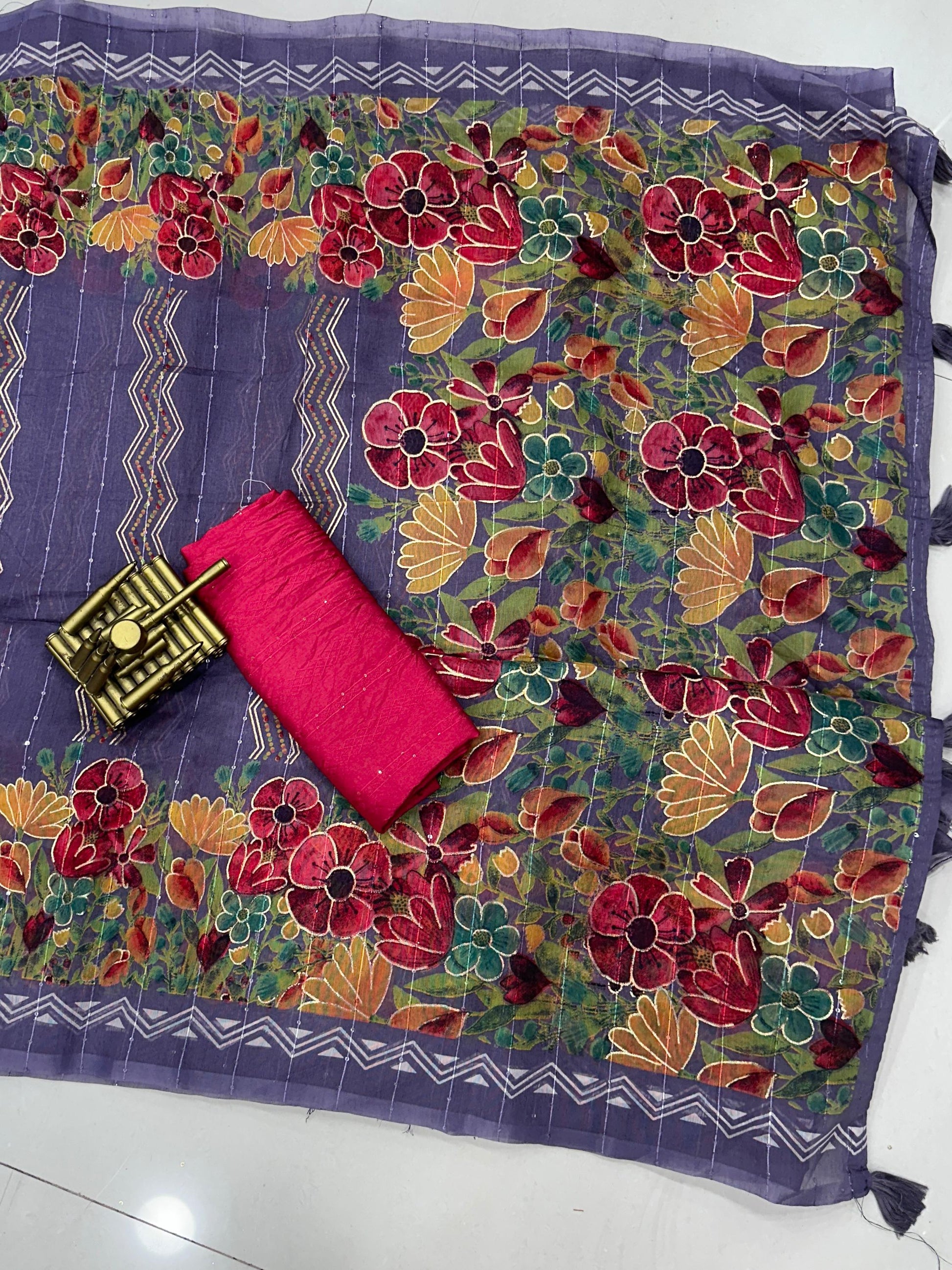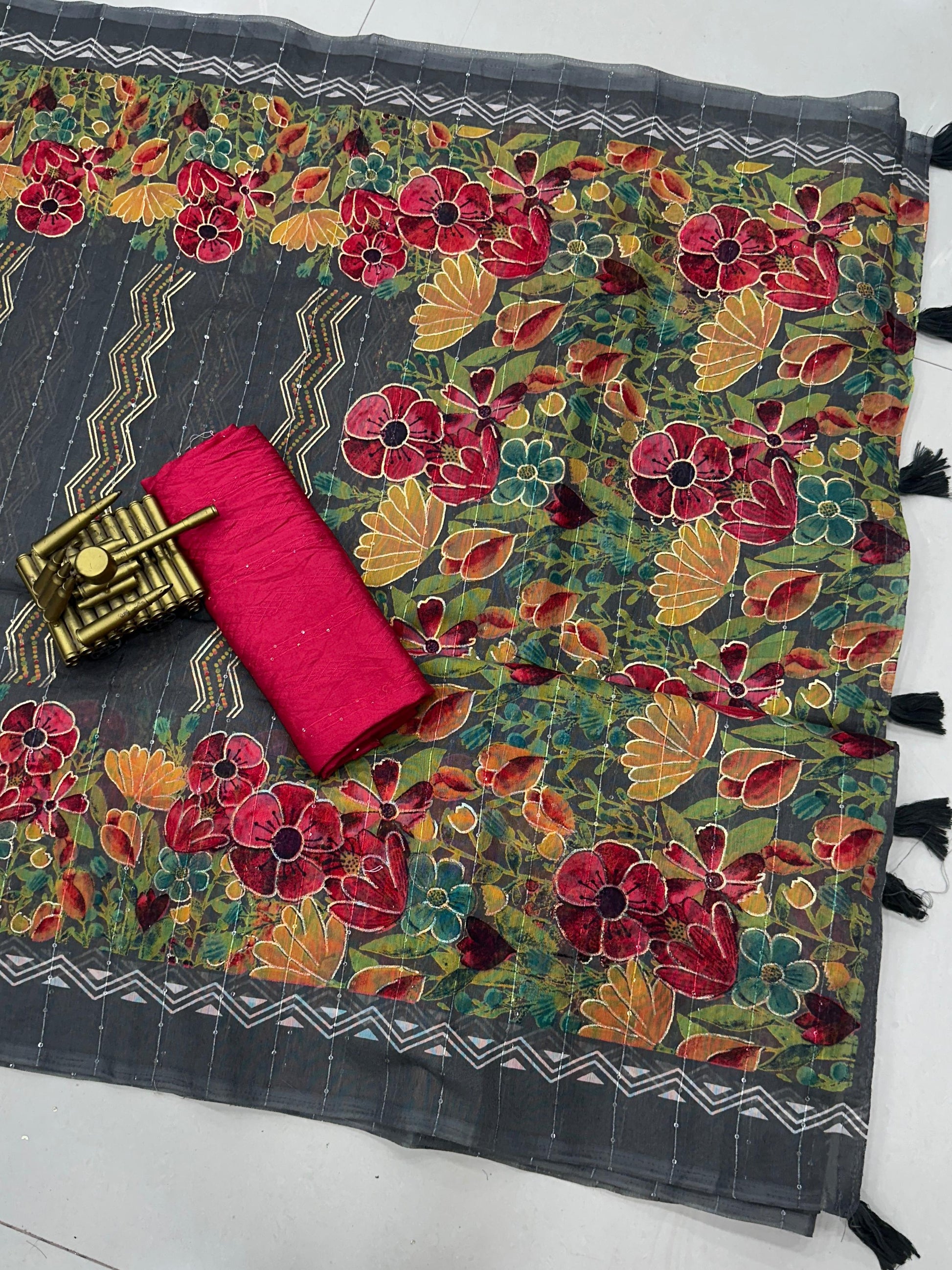 Designer floral print saree with sequin weaving & golden foil outing & tussles in pallu with self jacquard blouse. |