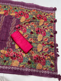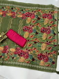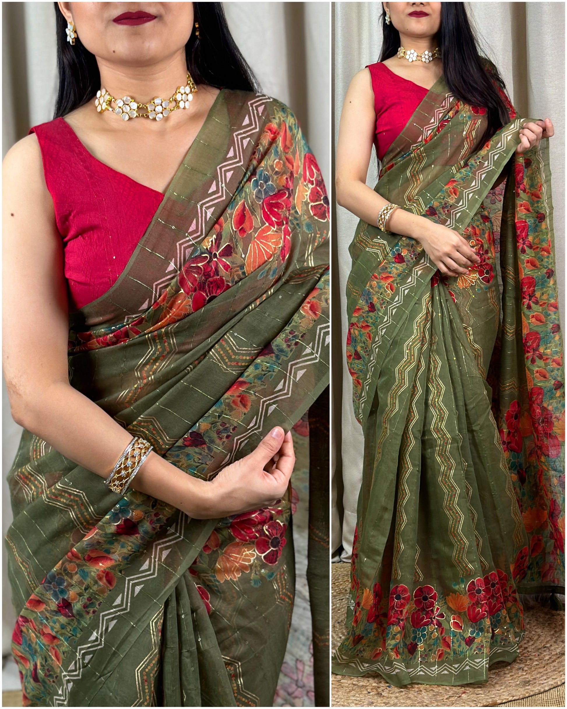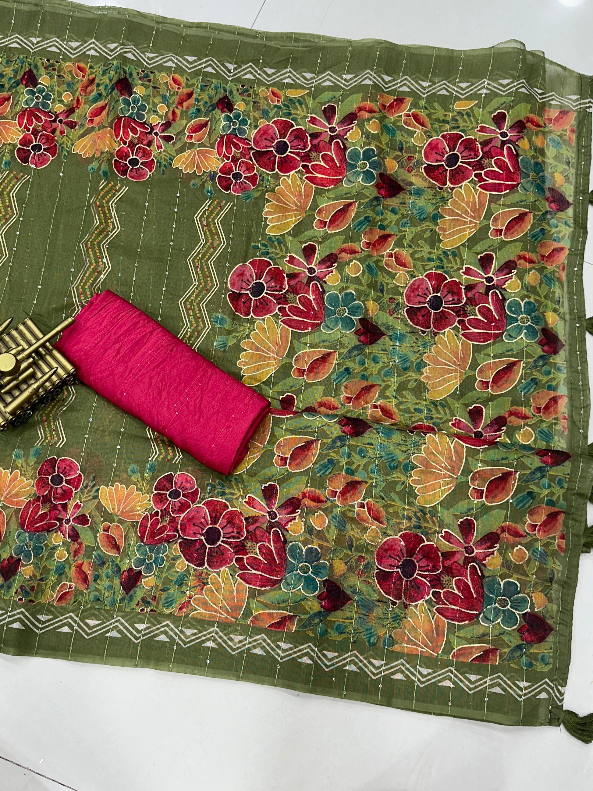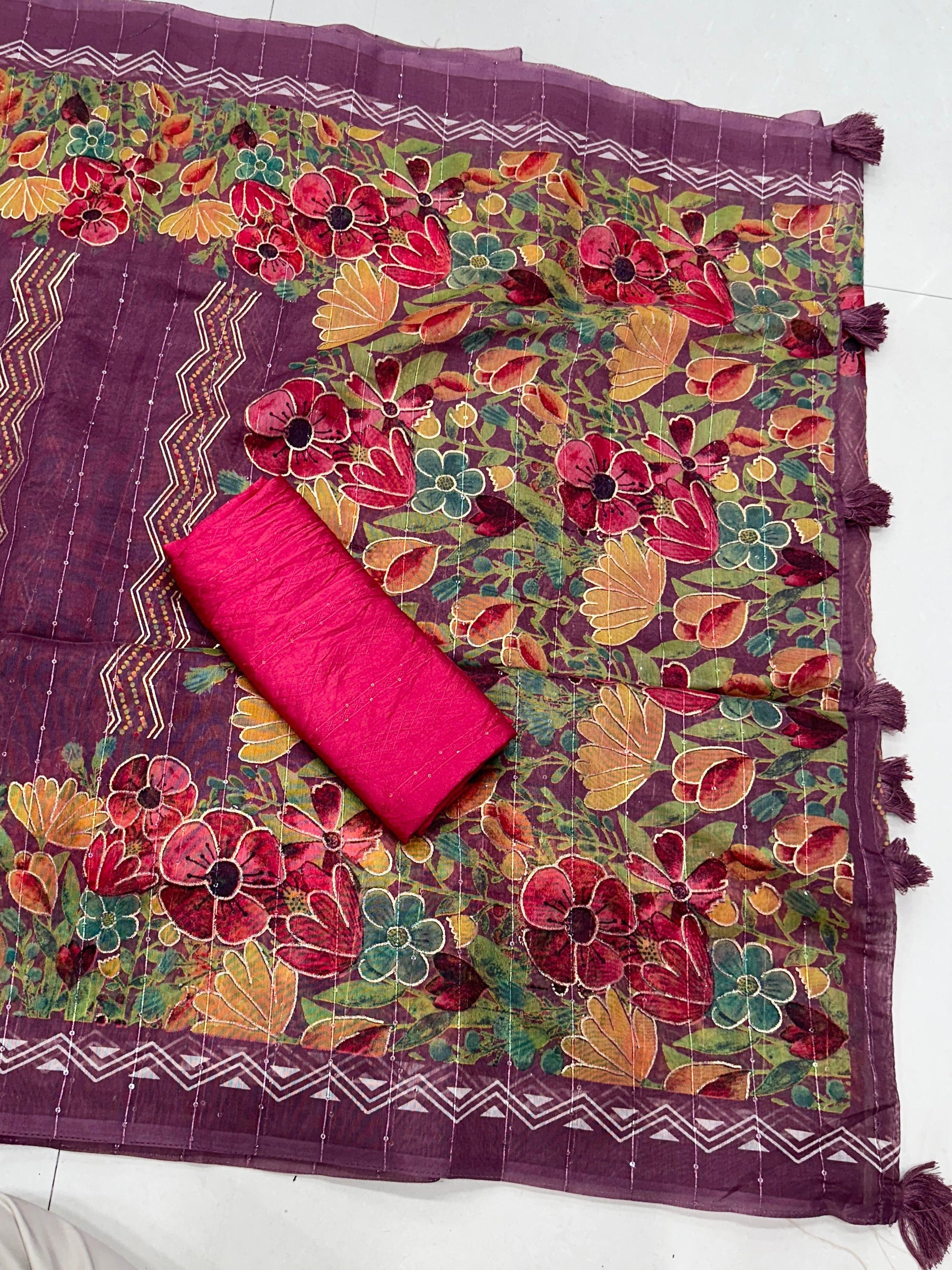 Designer floral print saree with sequin weaving & golden foil outing & tussles in pallu with self jacquard blouse. |