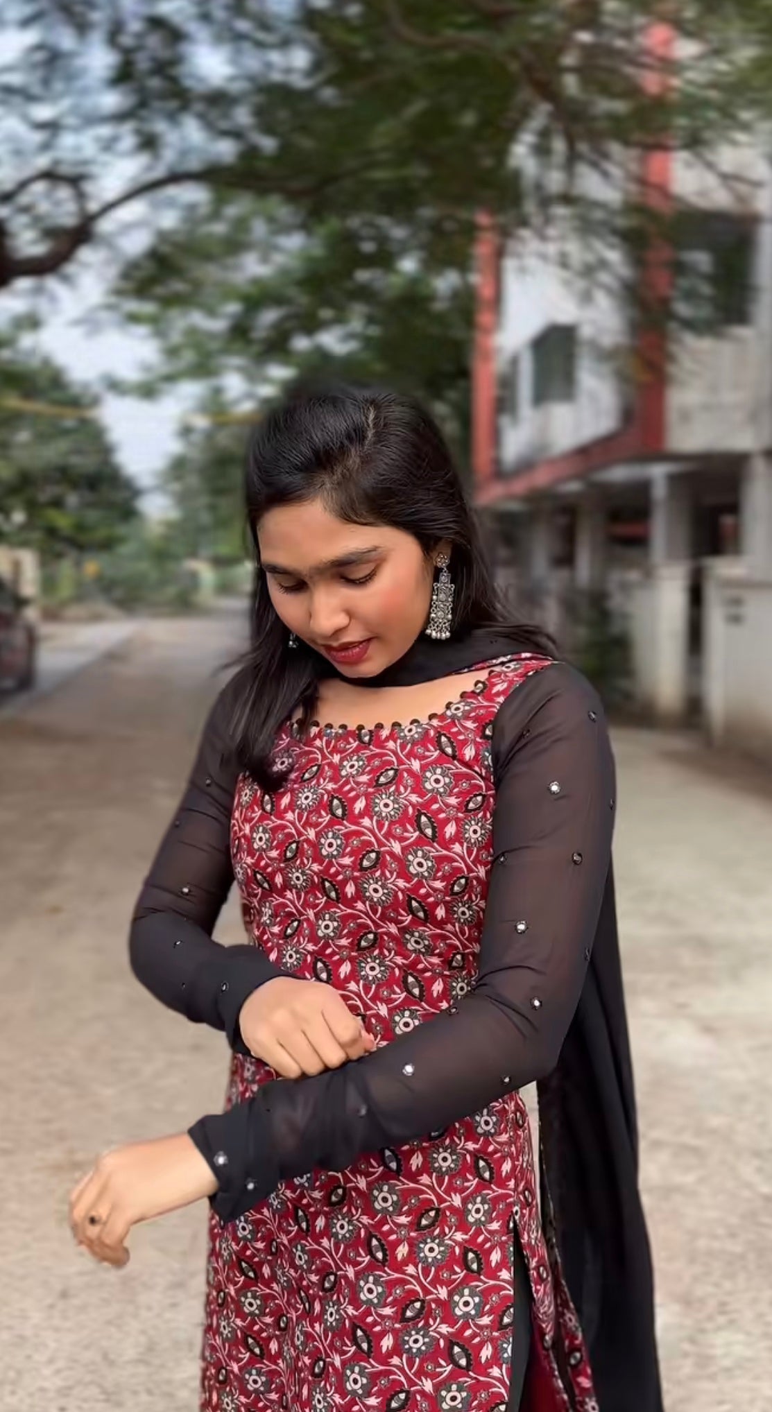 - Sheer black full sleeves for a stylish contrast